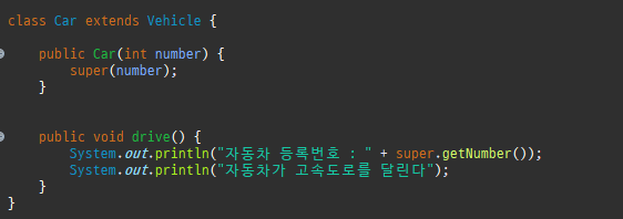 Car 클래스는 number 필드와 getNumber() 메서드를 가지고 있습니다. Car(int number) 생성자는 Vehicle 클래스의 생성자를 호출하여 number 필드를 초기화합니다. super(number)를 통해 부모 클래스인 Vehicle 클래스의 생성자를 호출합니다. Car 클래스의 인스턴스가 생성될 때 number 필드가 초기화됩니다. drive() 메서드는 자동차가 고속도로를 달리는 기능을 나타냅니다. super.getNumber() 를 통해 부모 클래스인 Vehicle 클래스의 getNumber 메서드를 호출하여 자동차의 등록번호를 호출하고 있습니다.