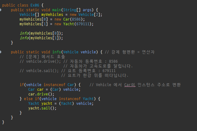 if(vehicle instanceof Car) { } : instanceof 연산자를 사용하여 매개변수로 받은 vehicle 이 Car 클래스의 인스턴스인지, Yacht 클래스의 인스턴스인지를 확인합니다.