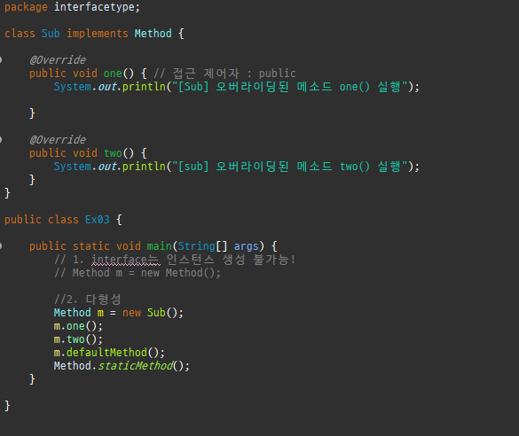 Method m = new Sub(); : 인터페이스는 인스턴스 생성이 불가능하므로 Method m = new Sub(); 와 같이 인터페이스를 구현한 클래스의