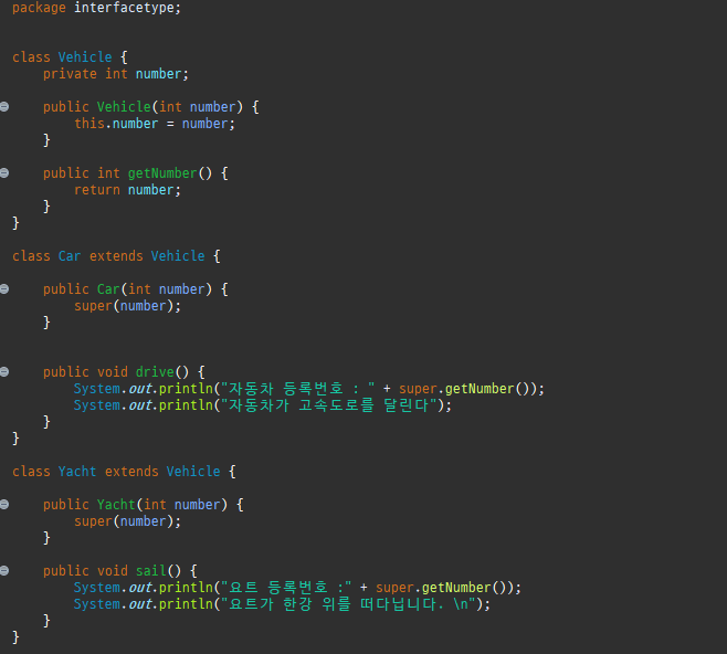 위 코드는 Vehicle 클래스를 상속받아 'Car'와 'Yacht' 클래스를 정의하고 있습니다.