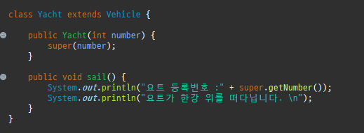 Yacht 클래스는 Vehicle 클래스를 상속 받습니다. number 필드와 getNumber() 메서드를 상속 받습니다. Yacht(int number) 생성자는 Vehicle 생성자를 호출하여 number 필드를 초기화합니다. 이를 통해 요트의 등록 번호를 설정할 수 있습니다. sail() 메서드는 요트가 향해하는 기능을 나타냅니다. 이 메서드는 System.out.println()을 사용하여 요트의 등록 번호를 출력하고 요트가 한강 위를 향해하는 메시지를 출력합니다.