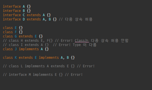 class K extends E implements A, B {} : class K는 클래스 E를 상속하고 인터페이스 A와 B를 구현합니다.